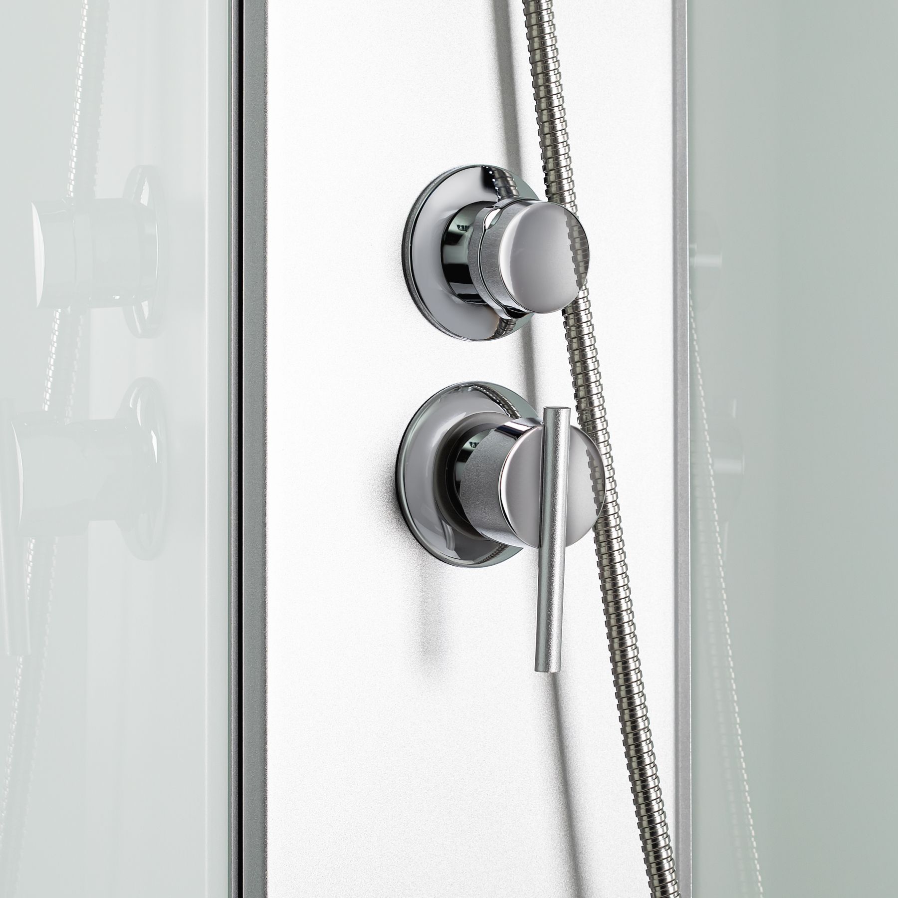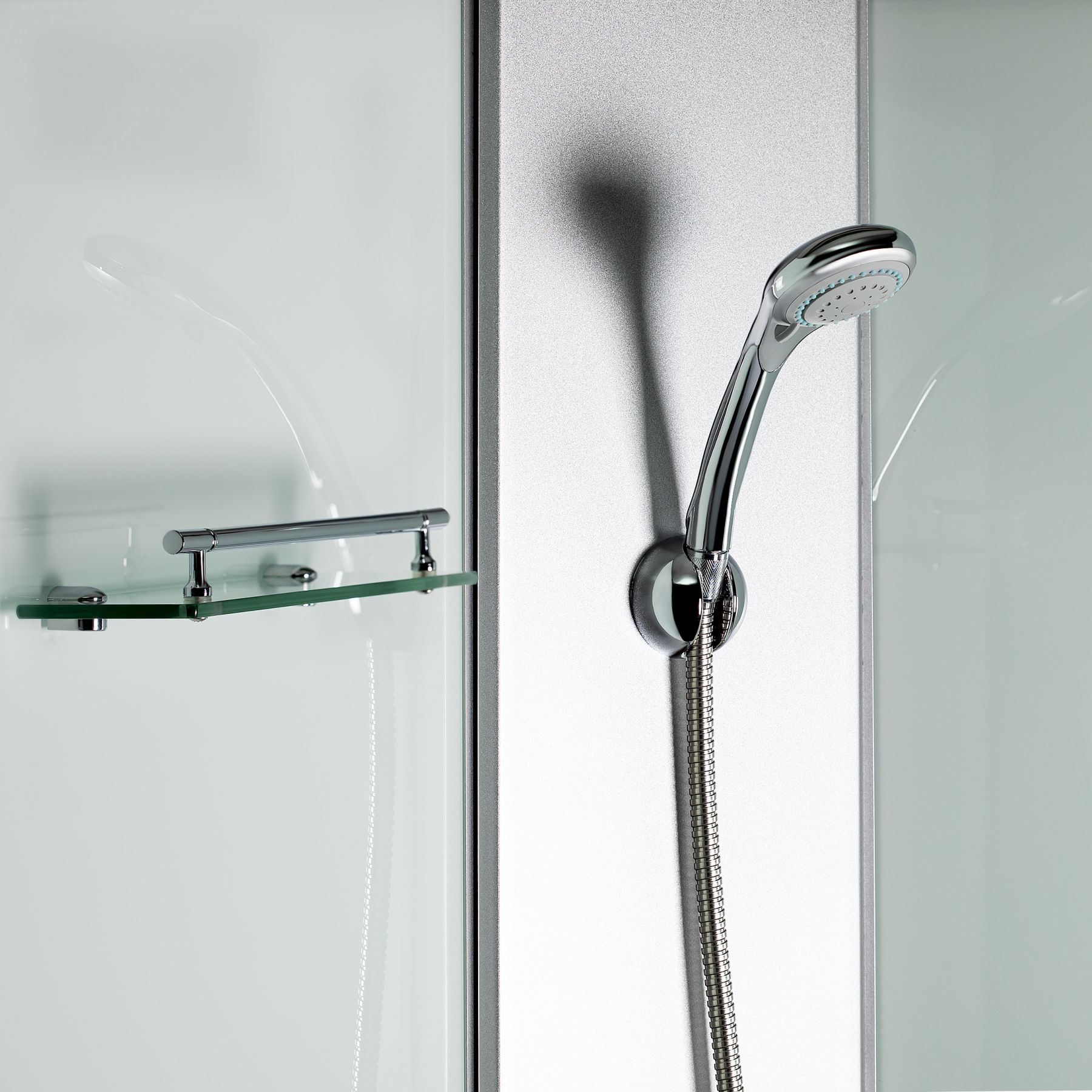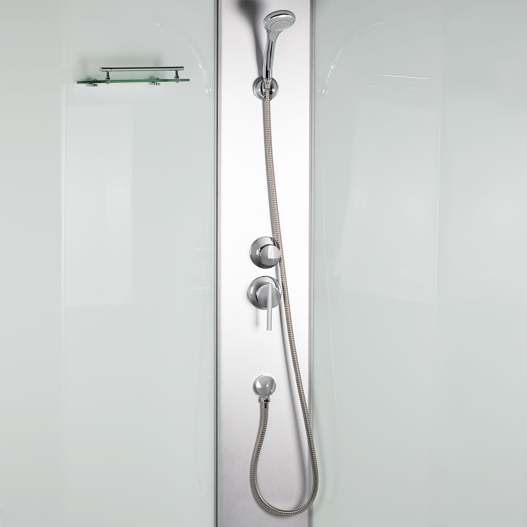 Комплектація:Піддон, сифон, двері, ручки, ролики, профіль, комплект кріплень, задня стінка, панель, змішувач, лійка для ручного душу, лійка для верхнього душу, душовий шланг, кронштейн, ніжки, верхня кришка, скляна полиця.