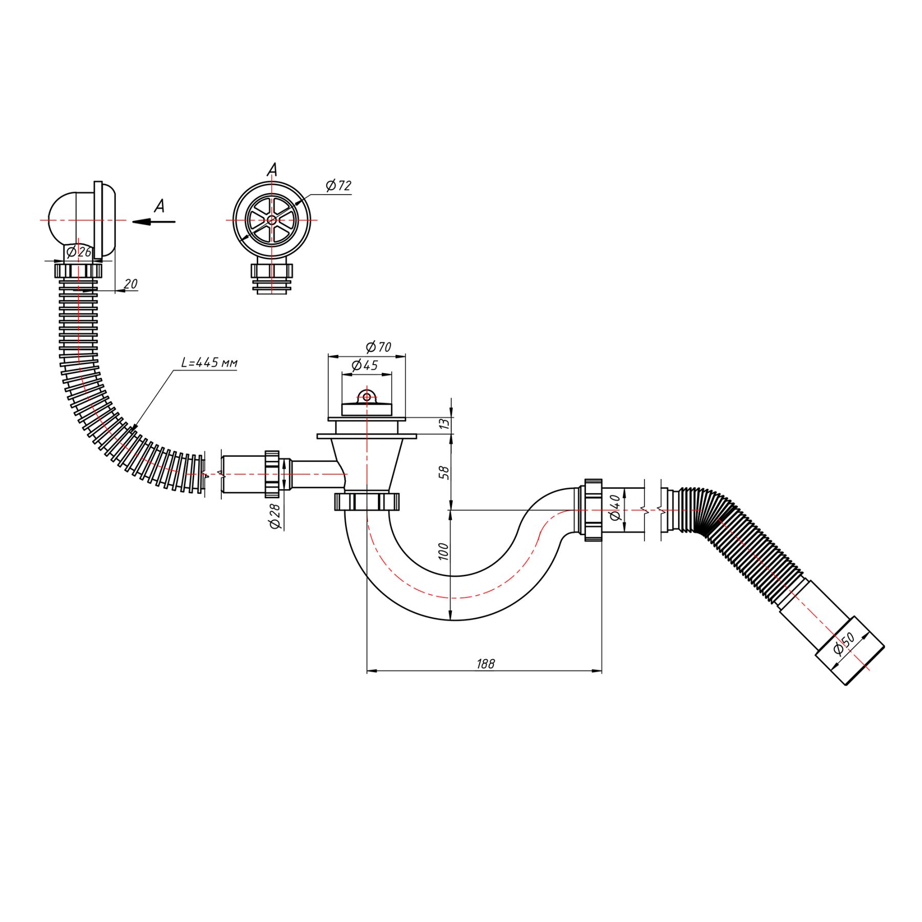 Додаткові характеристики:Довжина переливу: 445 мм. Довжина гофрованої труби: 235 – 425 мм.