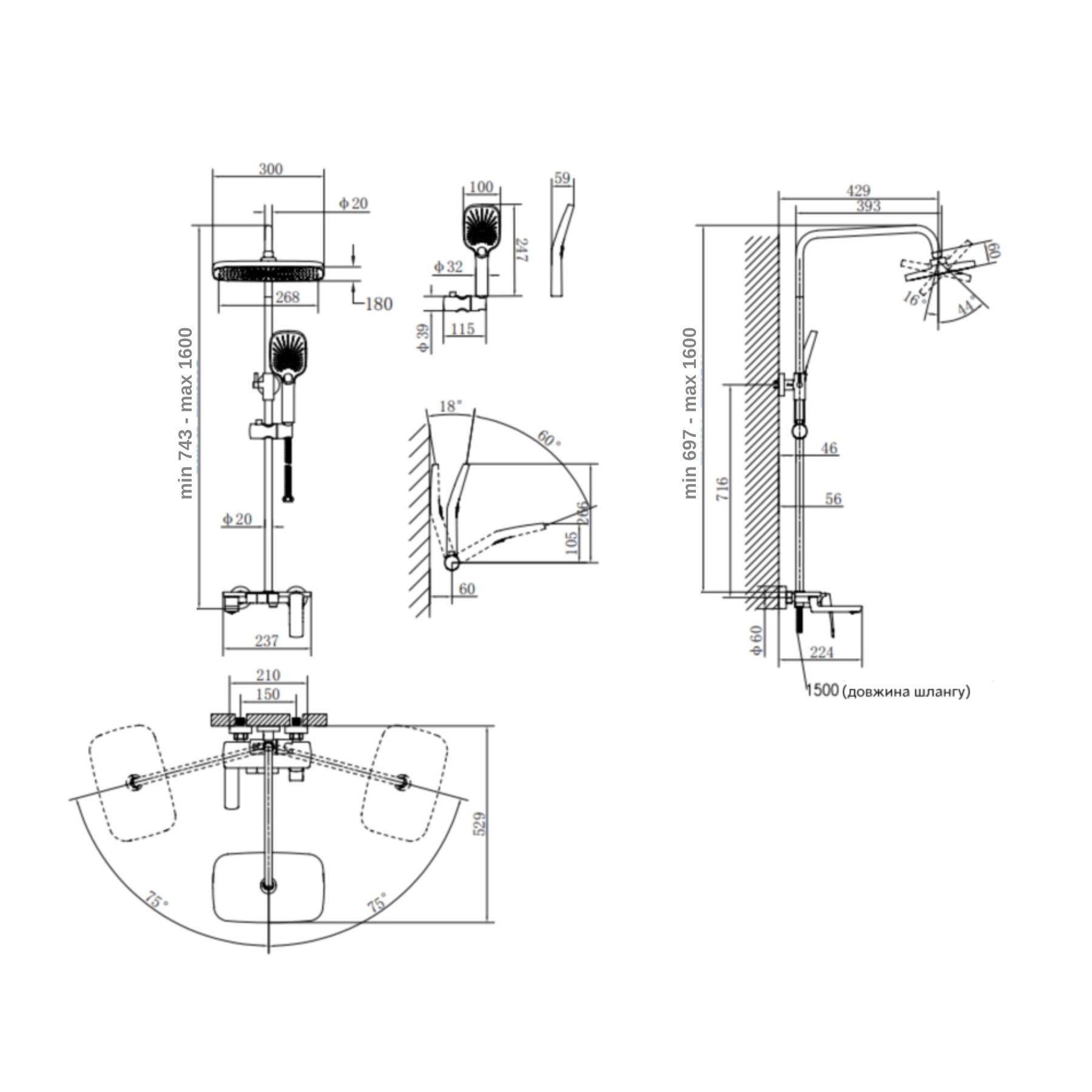 Висота душової стійки, мм:850-1200