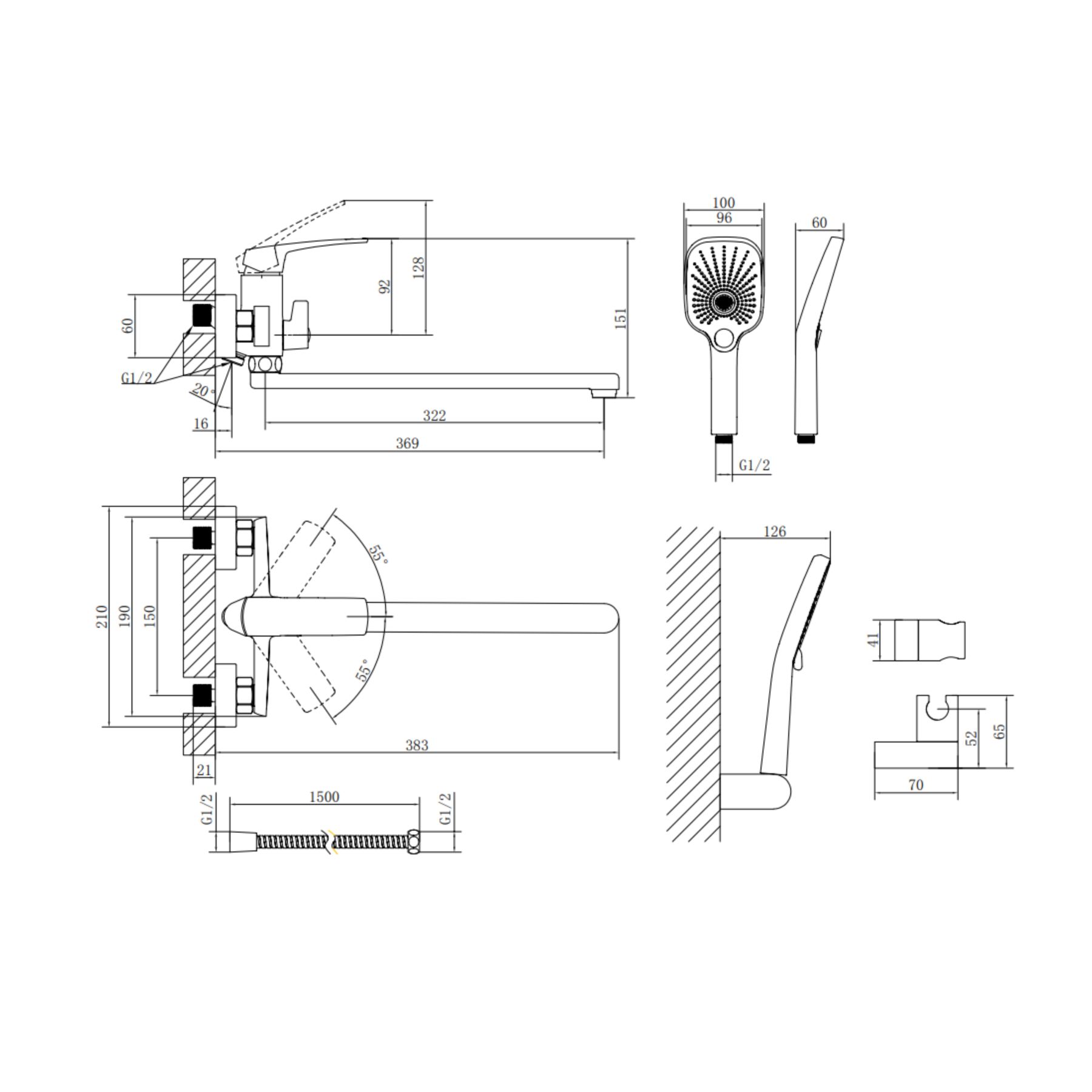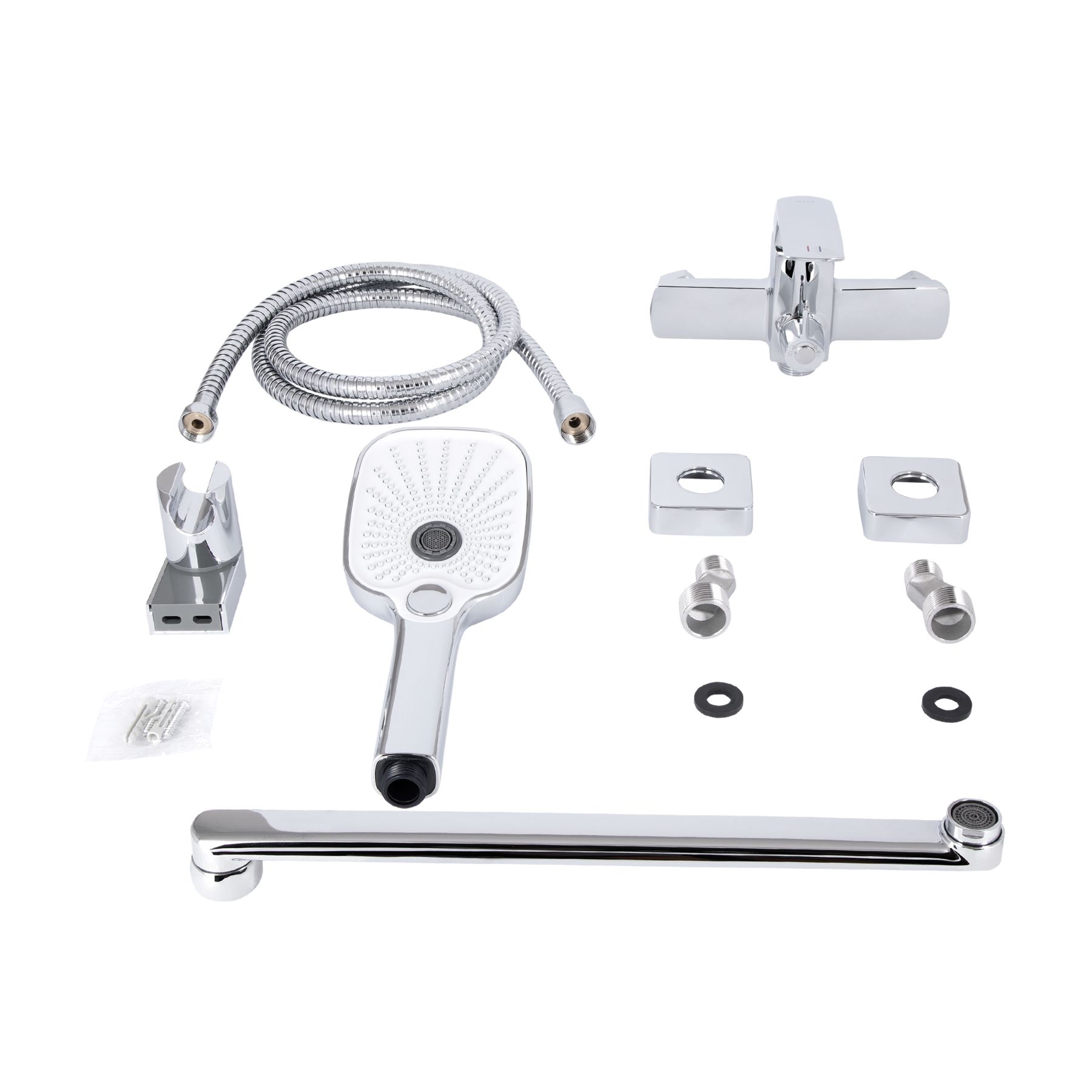 Комплектація:Змішувач, лійка для ручного душу, душовий шланг, кронштейн для ручного душу, кріплення.