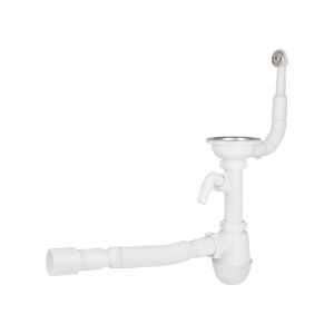 Сифон для кухонної мийки з переливом Lidz LK01 виготовлений із пластику білого кольору у вигляді склянки - колби з металевими гратами та гофрованих труб. Резервуар сифону відкручується для очищення. Гофрований вихід дає можливість змінювати довжину та кут труби. Завдяки комунікації для переливу можна уникнути переповнення кухонної раковини водою.