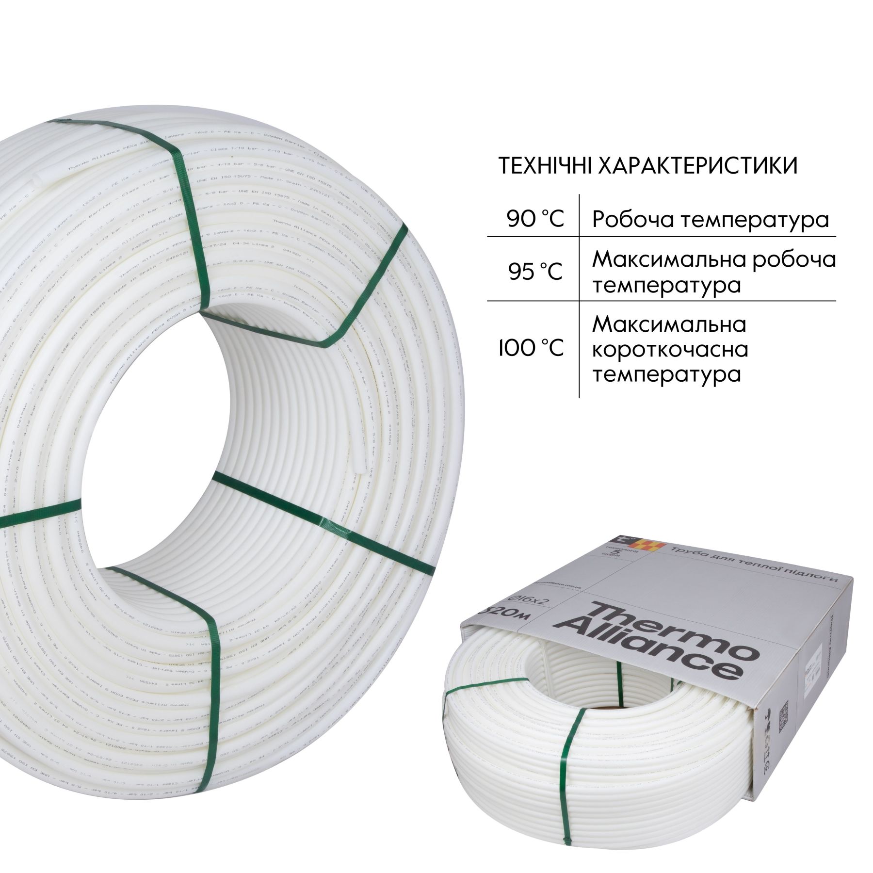 Труба PEX-A EVOH WHITE діаметром 16x2 від Thermo Alliance, вироблена в Іспанії, є високоякісною трубопровідною системою з антикисневим бар'єром EVOH, яка запобігає корозії і збільшує термін служби системи опалення. Виготовлена за технологією PEX-A, труба має високу гнучкість, міцність і стійкість до високих температур, що робить її ідеальною для монтажу в системах теплої підлоги. Довжина 320 метрів забезпечує зручність та економічність при встановленні на великих площах.