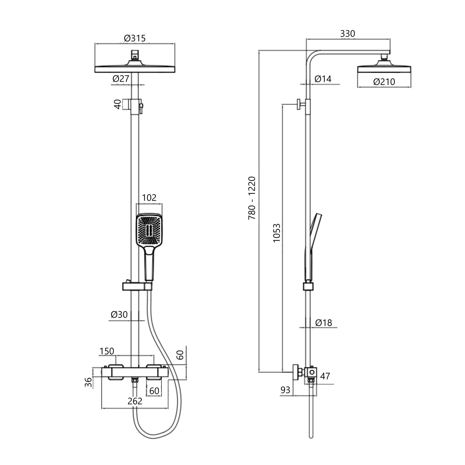 Висота душової стійки, мм:780-1220
