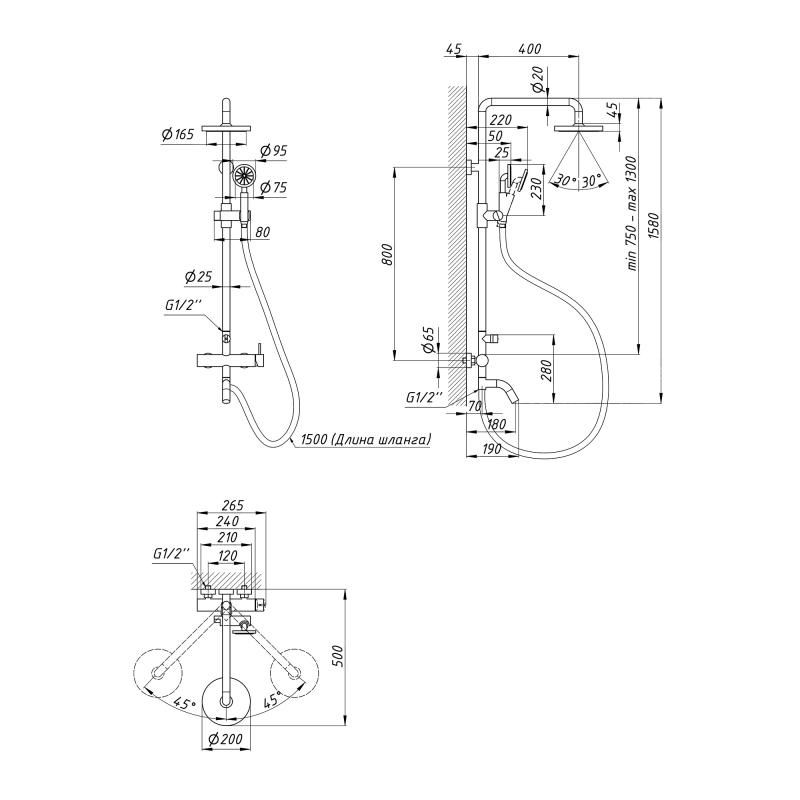Діаметр лійки, мм:Ручний душ: 95. Верхній душ: 200