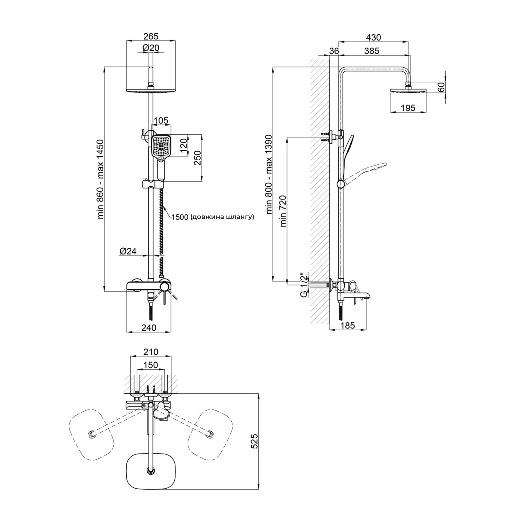 Висота душової стійки, мм:950-1350