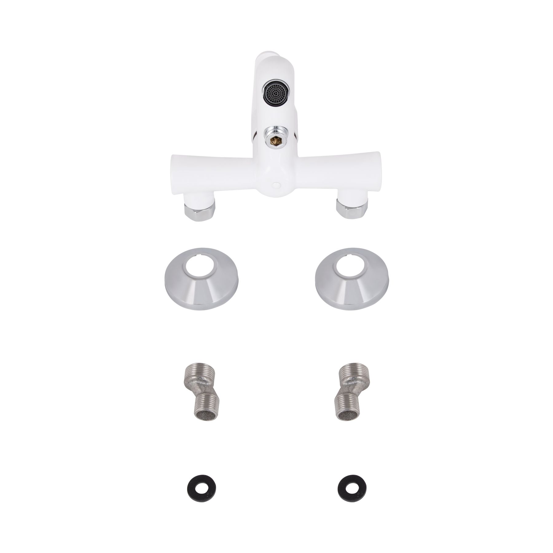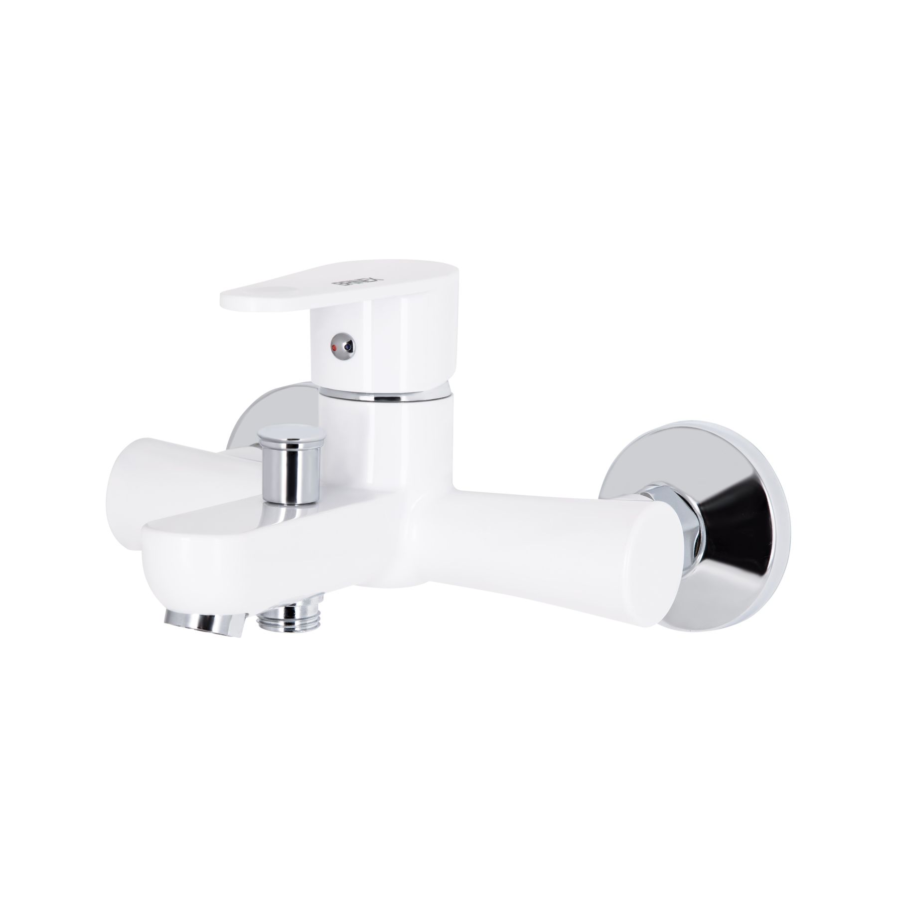 Змішувач для ванни Brinex 37W 006 виконаний з пластику та має білу матову поверхню. Для вмикання подачі води досить підняти й повернути руків'я в необхідне положення. На нього нанесено маркування Х+Г води и фірмовий логотип виробника. Настінний монтаж змішувача здійснюється за допомогою кріпильних елементів з комплекту. Круглі розетки приховають похибки установки на обробці ванної кімнати.
