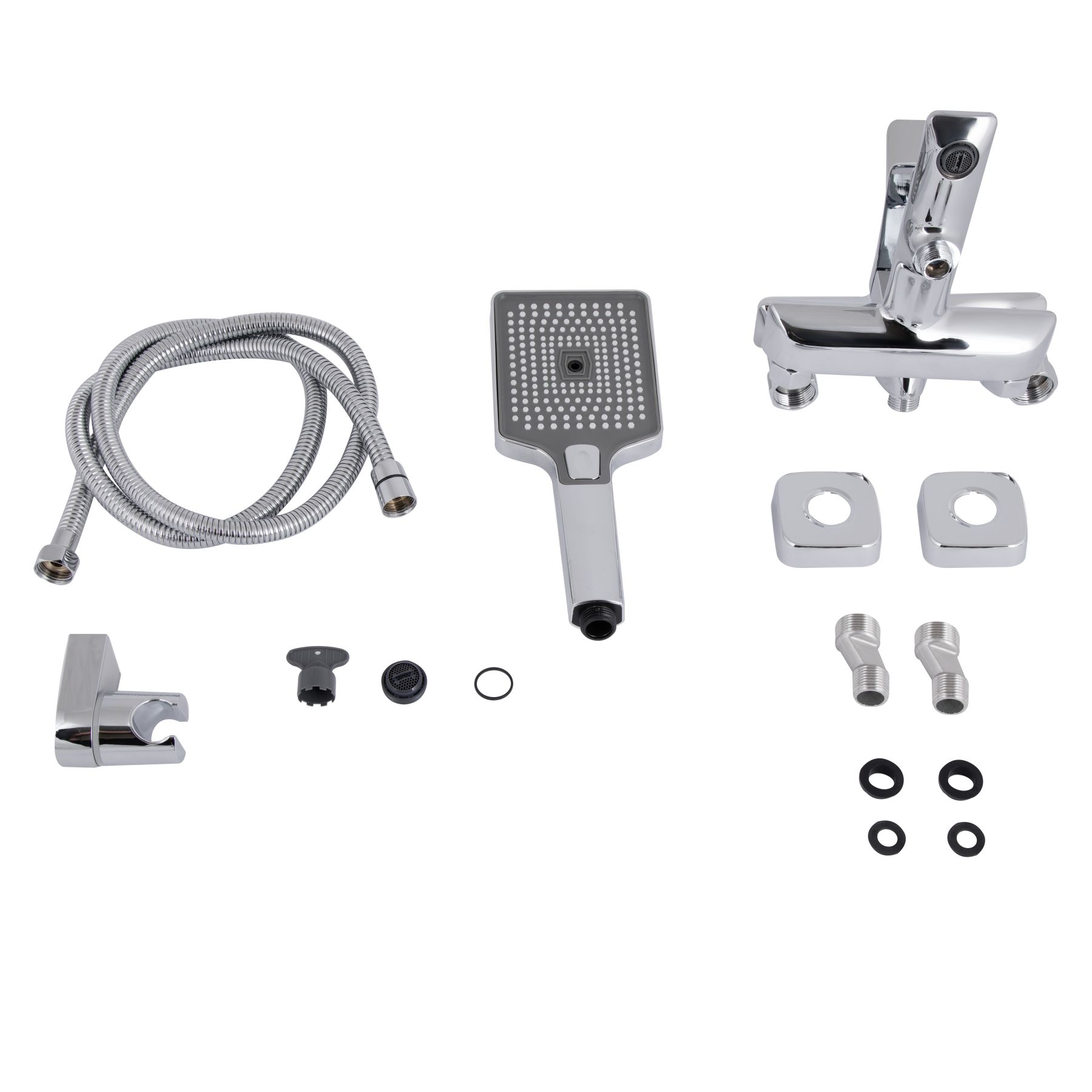 Комплектація:Змішувач, лійка для ручного душу, душовий шланг, кронштейн, деталі кріплення.